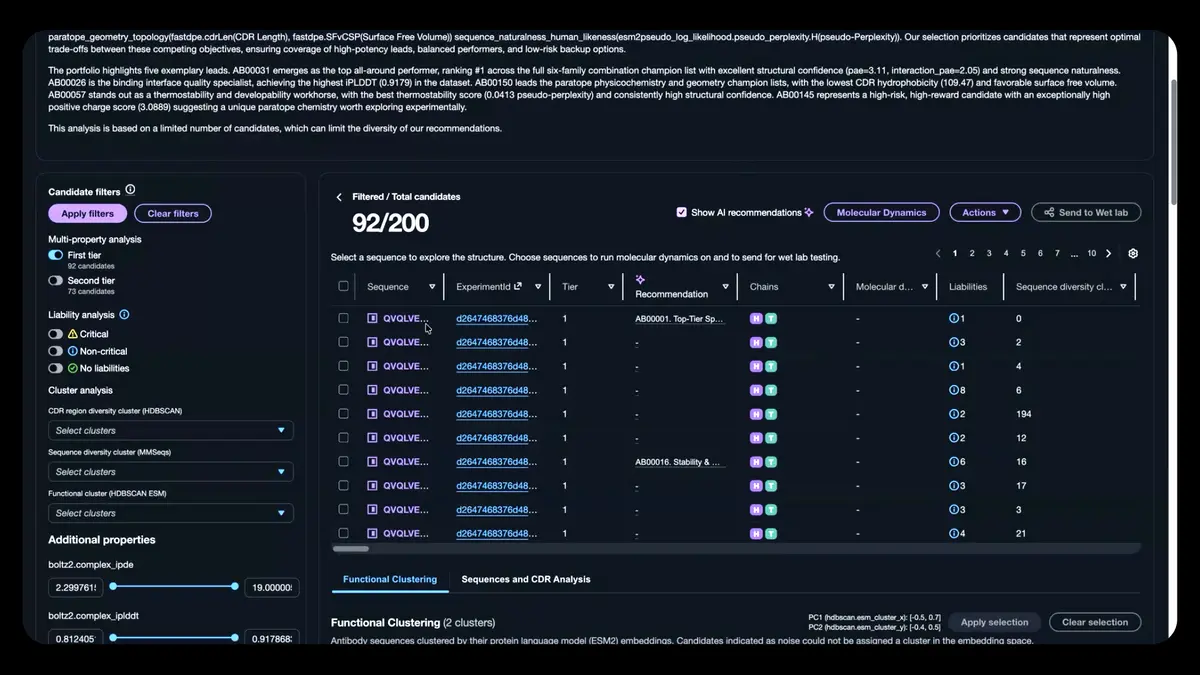 In a representative antibody design workflow, researchers first evaluate models and assemble an in silico pipeline. They then use the system to configure experiments, identify target residues and choose molecular frameworks before reviewing an AI-generated summary of results and a filtered set of candidates.