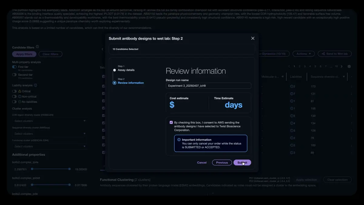 The application connects directly to contract research organisation partners including Ginkgo Bioworks, Twist Bioscience and A-Alpha Bio. Researchers can select assays and receive cost and turnaround estimates before submitting candidates for testing.