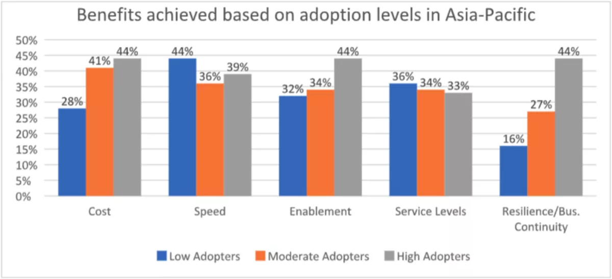 In APAC, high adopters outperformed low adopters most significantly in the areas of resilience/business continuity (44% vs 16%), cost (44% vs 28%) and business enablement (44% vs 32%). Interestingly, however, low adopters did outperform high and moderate adopters in speed-to-market and service levels.