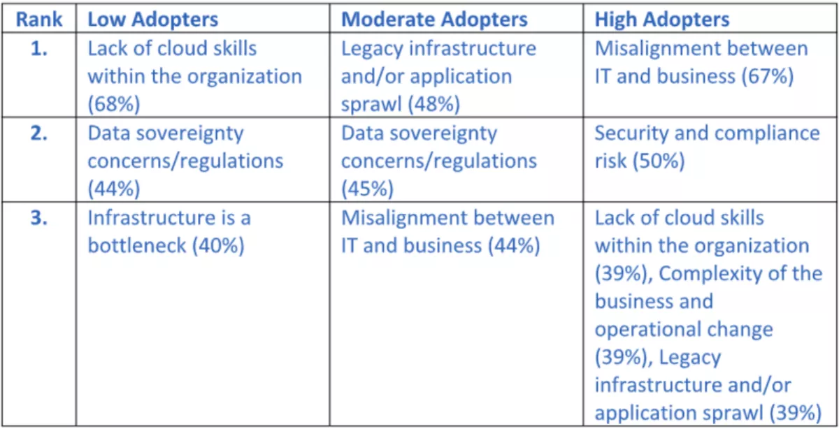Low cloud adopters were most concerned about lack of skills, data sovereignty matters and infrastructure becoming a bottleneck.