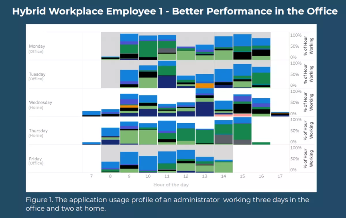 The comparison of the workers sheds light on how specific applications perform differently in home versus office environments, and highlights how different people use disparate applications in different patterns. Based on the comparison, employers can discern which roles are better-suited to remote working and which are best left in the office.