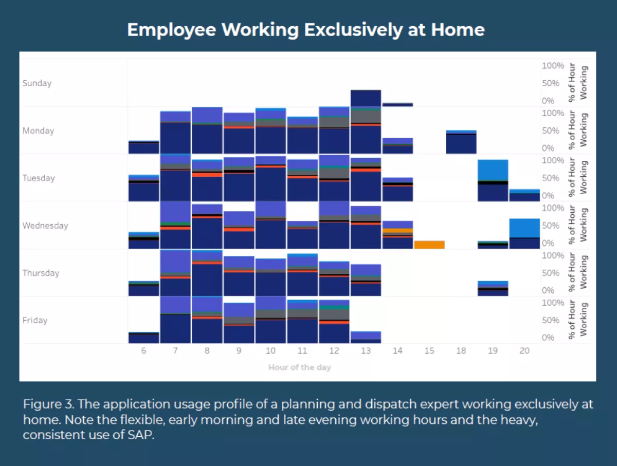 This employee's consistent use of applications day-to-day is something leaders should consider for remote work policies. When an employee uses a consistent set of applications throughout each day of their workweek, and those applications perform the same remotely as they do on-site, then they should have more flexibility in choice.