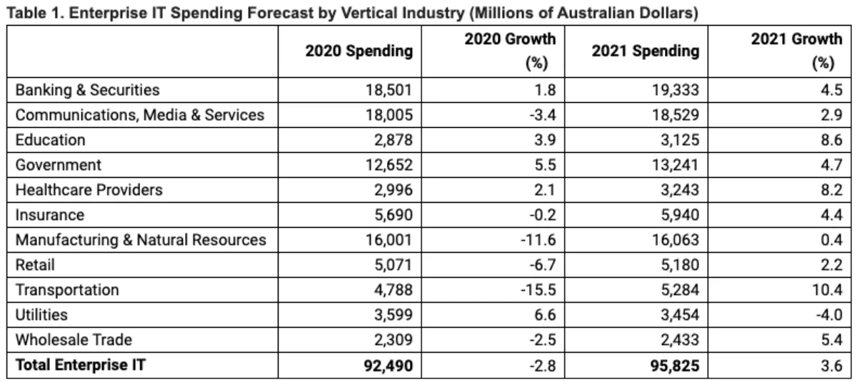 Enterprise IT spending across all industry sectors in Australia will grow 3.6% to reach more than AU$95.8 billion in 2021, following an expected 2.8% decline in 2020, according to the latest forecast by Gartner.