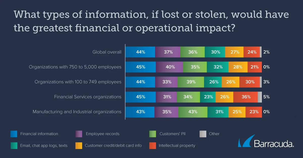 Not altogether surprisingly, financial data tops the list of information that, if lost or stolen, would have the greatest financial or operational impact on the organisation. Overall, 43% of respondents named this as one their two highest impact data losses.